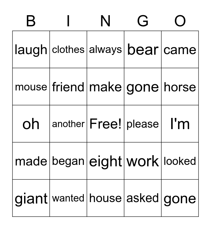 This bingo card has a free space and 29 words: giant, thought, another, people, laugh, always, friend, began, please, wanted, I'm, gone, house, asked, horse, school, eight, made, came, oh, work, magic, gone, mouse, bear, clothes, looked, make and baby.