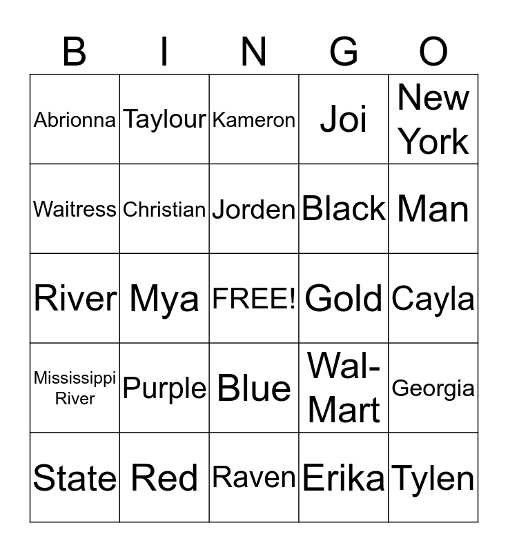 This bingo card has a free space and 24 words: Purple, Red, Jorden, State, New York, Abrionna, Waitress, Taylour, Gold, Blue, Black, River, Wal-Mart, Georgia, Christian, Erika, Cayla, Kameron, Man, Mya, Tylen, Mississippi River, Joi and Raven.