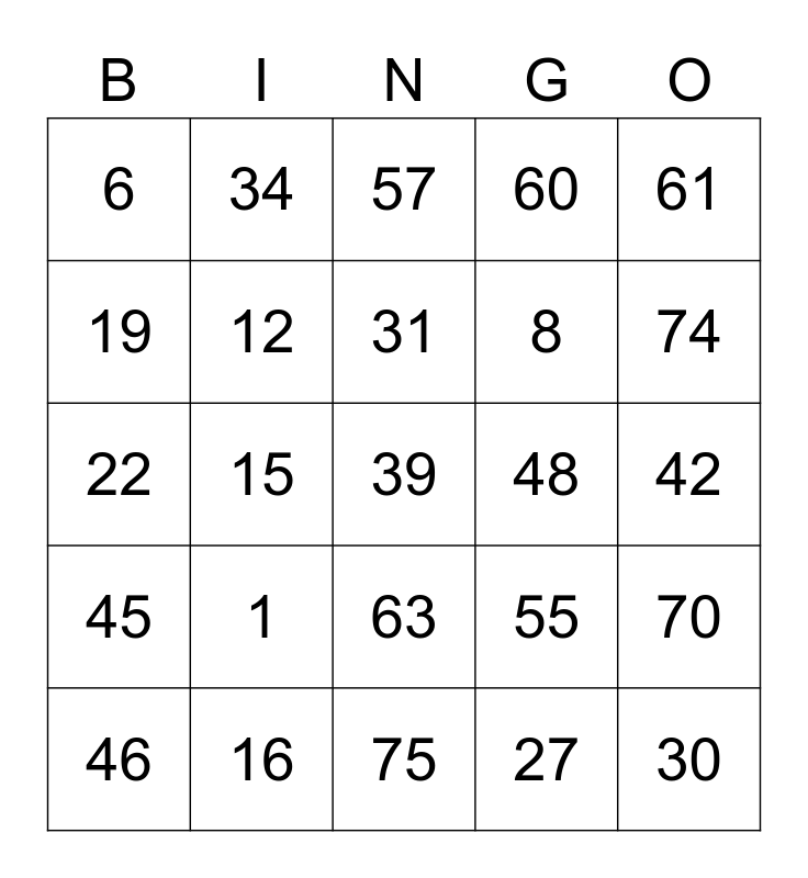 This bingo card has a free space and 24 words: 1, 16, 31, 46, 61, 6, 19, 34, 48, 63, 8, 22, 55, 70, 12, 27, 42, 57, 74, 15, 30, 45, 60 and 75.