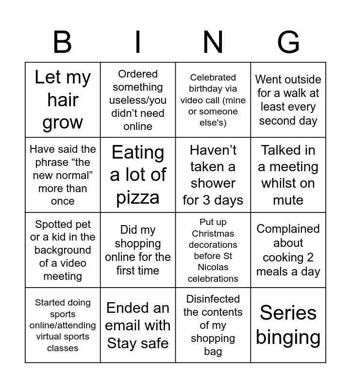 This bingo card has 16 words: Ended an email with Stay safe, Complained about cooking 2 meals a day, Celebrated birthday via video call (mine or someone else's), Let my hair grow, Spotted pet or a kid in the background of a video meeting, Ordered something useless/you didn’t need online, Put up Christmas decorations before St Nicolas celebrations, Disinfected the contents of my shopping bag, Have said the phrase “the new normal” more than once, Eating a lot of pizza, Started doing sports online/attending virtual sports classes, Went outside for a walk at least every second day, Did my shopping online for the first time, Talked in a meeting whilst on mute, Haven’t taken a shower for 3 days and Series binging.