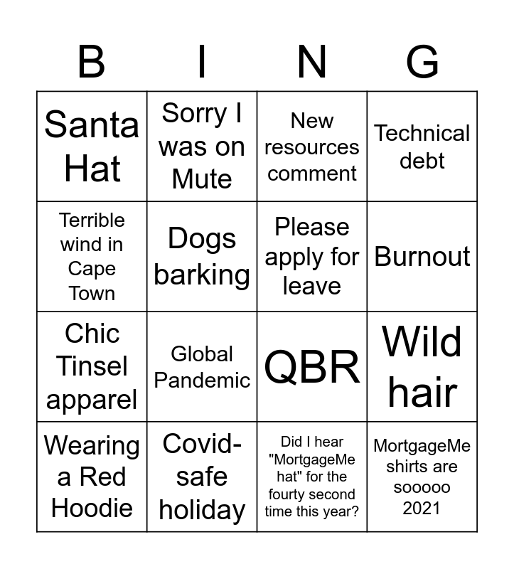 This bingo card has 46 words: Free!, Wearing a Red Hoodie, Surfboard in the background, Wearing a shirt backwards, Wearing a floral shirt, Data Points, Sorry I was on Mute, Imagine what I could do with more marketing budget, Dogs barking, Spot some kids on screen, Please apply for leave, Technical debt, Wearing open toe shoes, Searchworks Background, No fibre in their neighbourhood, Who is enjoying some fresh outdoor air?, Burnout, Covid-safe holiday, Table Mountain, Terrible wind in Cape Town, Wild hair, Glass of Champers, Santa Hat, Chic Tinsel apparel, Flex, Global Pandemic, Sipping on some hot coffee, Wearing Christmas bells, Dinosaur, MortgageMe shirts are sooooo 2021, Is there a reindeer in the hood?, Attention grabbing macarena, Christmas tree in background, Is it BEER time?, Bonuses, Its not Christmas until someone singa a carol, Did I hear "MortgageMe hat" for the fourty second time this year?, Sitting on exercise ball, Interrupted by a delivery? So rude, 2021 budgets, Received Board Approval of Budgets, New resources comment, QBR, Is it too bright in here? Sunglasses ON!, Springbok fever and Is there a newly grown beard in town?.