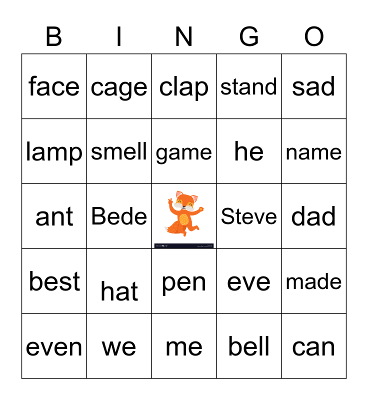 This bingo card has a free space and 24 words: hat, we, game, even, sad, face, lamp, cage, Steve, pen, he, ant, eve, made, smell, bell, dad, clap, name, Bede, can, best, stand and me.
