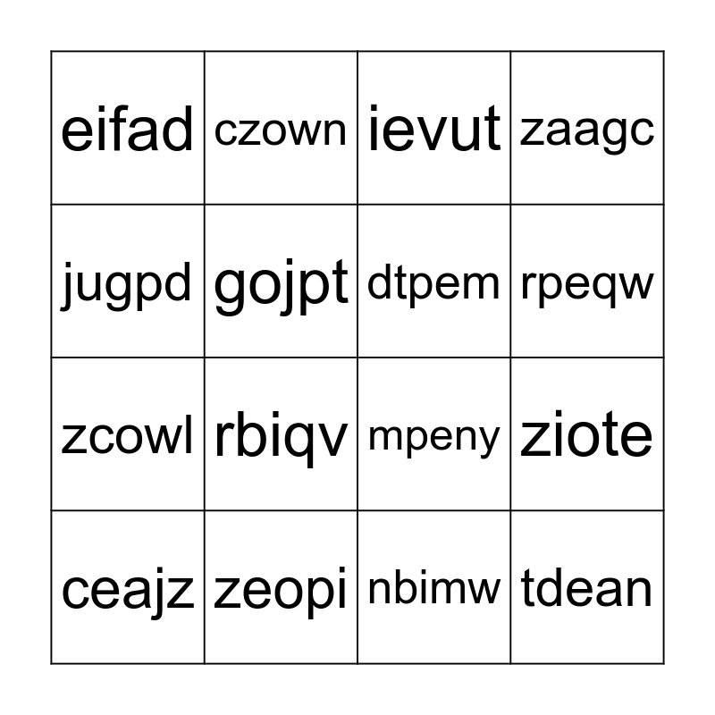 This bingo card has 16 words: zeopi, ziote, ievut, eifad, zcowl, czown, mpeny, nbimw, jugpd, gojpt, ceajz, zaagc, rbiqv, rpeqw, dtpem and tdean.
