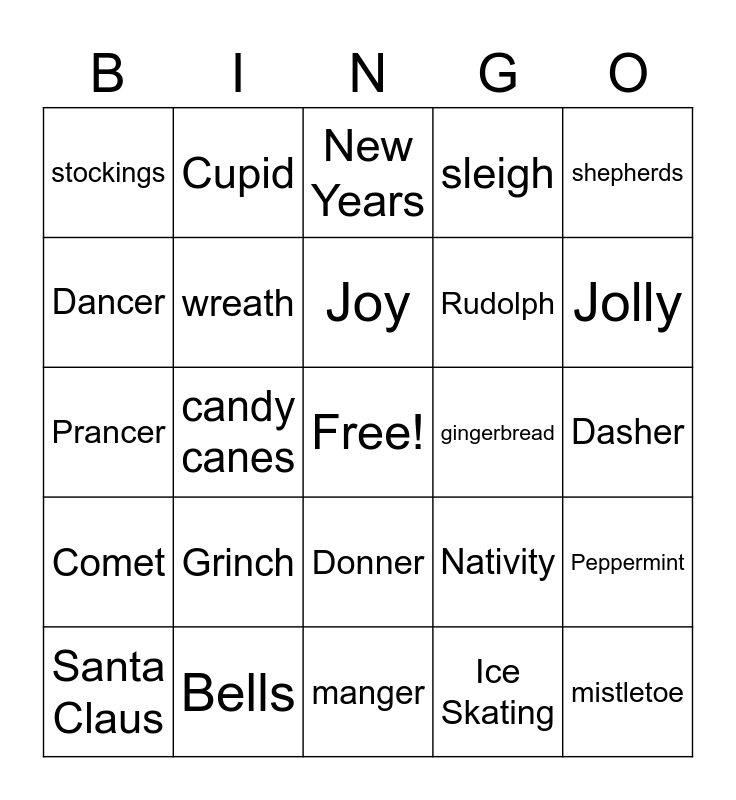 This bingo card has a free space and 56 words: Merry Christmas, Santa Claus, Elves, stockings, manger, Christmas Tree, wreath, North Pole, Rudolph, family, sleigh, Noel, Angel, Jingle Bells, Silent Night, eggnog, shepherds, candy canes, lights, mistletoe, gingerbread, ornaments, Nativity, New Years, Fa La La, Joy, Jingle, Snowman, Jolly, Snow, Frosty, Gift, Holly, Bright, Dasher, Dancer, Prancer, Vixen, Comet, Cupid, Donner, Blitzen, Cookies, Ho Ho Ho, Cocoa, Grinch, Bells, Candle, Chimney, Feliz Navidad, Ice Skating, Sweater, unwrap, Star, Peppermint and List.