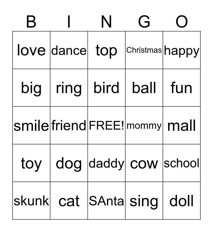 This bingo card has a free space and 24 words: dog, cat, bird, skunk, happy, love, big, dance, mommy, daddy, ball, smile, cow, school, ring, sing, mall, top, fun, friend, doll, toy, Christmas and SAnta.