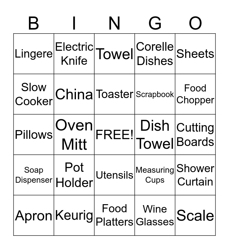 This bingo card has a free space and 26 words: Utensils, Wine Glasses, Toaster, Keurig, Sheets, Lingere, Slow Cooker, Electric Knife, Cutting Boards, Measuring Cups, Scrapbook, Pillows, Shower Curtain, Apron, Oven Mitt, Knife Set, Corelle Dishes, Soap Dispenser, Towel, Scale, Food Chopper, Food Platters, Dish Towel, Pot Holder, China and Crackle Tumbler.