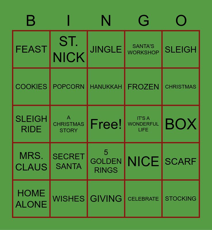 This bingo card has a free space and 164 words: HOLIDAY, STOCKING STUFFER, MISTLETOE, FAMILY, WREATH, UGLY SWEATER, ORNAMENT, PRESENTS, SANTA, EGG NOG, COOKIES, GINGERBREAD, JINGLE, NAUGHTY, NICE, PEPPERMINT, JOY, NOEL, PEACE, ELF, MERRY, CHEER, HO HO HO, FRUIT CAKE, SANTA'S HELPERS, RUDOLPH, NORTH POLE, MILK, COAL, SNOW MAN, SNOWFLAKE, BUTTON NOSE, SLEIGH, HOLLY, SNOW, GRINCH, BRIGHT, REINDEER, WISH, TREE, CANDY, TINSEL, BELLS, CANDY CANE, HOT COCOA, SCROOGE, COZY, DECEMBER, CAROLS, STAR, MARIAH CAREY, LAST CHRISTMAS, ADVENT, ANGEL, BLITZEN, BLIZZARD, BOW, BOX, CANDLE, JOYFUL, CELEBRATE, CHESTNUTS, CHRISTMAS, CHRISTMAS EVE, GIFT, SECRET SANTA, MIRACLE, CIDER, COMET, CUPID, CRANBERRIES, FROZEN, FIGGY PUDDING, FRIENDSHIP, FROSTY, ICE SKATING, HUGS, ICICLES, JINGLE BELLS, KWANZA, DREIDEL, HANUKKAH, LAUGHTER, DRUMMER BOY, GOODWILL, MAGIC, WASSAIL, MITTENS, SCARF, MRS. CLAUS, NUTCRACKER, NUTMEG, CINNAMON, FIR, PARTRIDGE, PLUM PUDDING, POPCORN, RIBBON, SEASON GREETINGS, SILVER BELLS, SNOW ANGEL, STOCKING, DONNER, DASHER, DANCER, PRANCER, VIXEN, HOME ALONE, SLEIGH RIDE, FIRST NOEL, SILENT NIGHT, CHRISTMAS CARD, MERRY CHRISTMAS, MELE KALIKIMAKA, 12 DAYS OF XMAS, CHIPMUNKS SONG, RUN RUDOLPH RUN, JINGLE BELL ROCK, FAMILY REUNION, 7 SWANS A SWIMMING, GIVING, WRAPPING PAPER, LETTERS, WISHES, HAPPINESS, HOPE, CHOIR, FEAST, 2 TURTLE DOVES, 3 FRENCH HENS, 5 GOLDEN RINGS, 4 CALLING BIRDS, 6 GEESE A LAYING, ST. NICK, KRIS KRINGLE, SUGARPLUM, SEASONS GREETINGS, MINCE PIE, TOBOGGAN, TOGETHERNESS, 8 MAIDS A MILKING, 9 LADIES DANCING, 10 LORDS A LEAPING, 11 PIPERS PIPING, 12 DRUMMERS DRUMMING, A CHRISTMAS STORY, CHARLIE BROWN CHRISTMAS, MIRACLE ON 34TH ST., IT'S A WONDERFUL LIFE, A CHRISTMAS CAROL, POLAR EXPRESS, JINGLE ALL THE WAY, UNDERNEATH THE TREE, THIS CHRISTMAS, CHIMNEY, SANTA'S WORKSHOP, GLOVES, SNOW BOOTS, DECORATE, NATIVITY, SLED, SPIRITS, TRADITION and TURKEY.