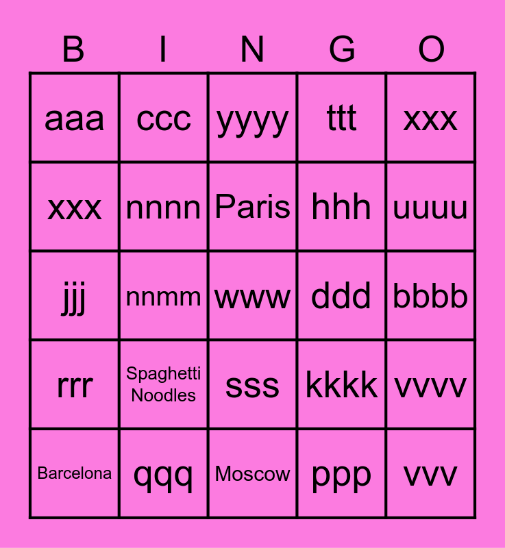This bingo card has 25 words: Spaghetti Noodles, Moscow, Paris, Barcelona, xxx, aaa, xxx, ccc, ddd, sss, hhh, jjj, kkkk, vvvv, nnnn, vvv, bbbb, yyyy, uuuu, nnmm, www, qqq, rrr, ttt and ppp.