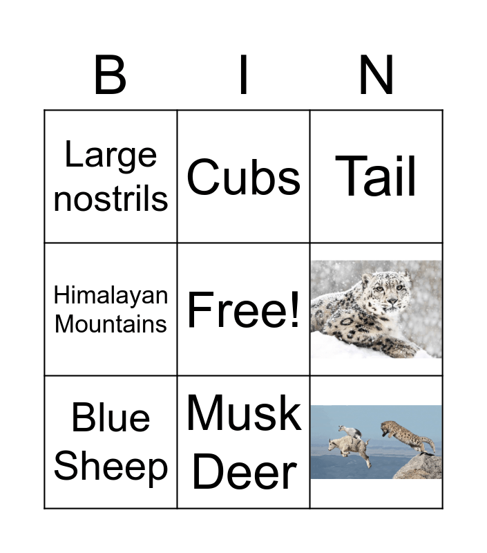 This bingo card has 6 images, a free space and 11 words: Snow Leopard, Paws, Tail, Large nostrils, Climbing, Himalayan Mountains, Predator, Blue Sheep, Musk Deer, Far Jumpers and Cubs.