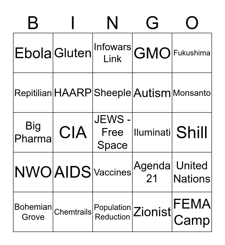This bingo card has a free space and 24 words: AIDS, Chemtrails, Sheeple, Bohemian Grove, Fukushima, Ebola, Repitilian, Gluten, Iluminati, Vaccines, Autism, Big Pharma, Agenda 21, United Nations, HAARP, Zionist, Shill, Infowars Link, Monsanto, CIA, FEMA Camp, NWO, GMO and Population Reduction.
