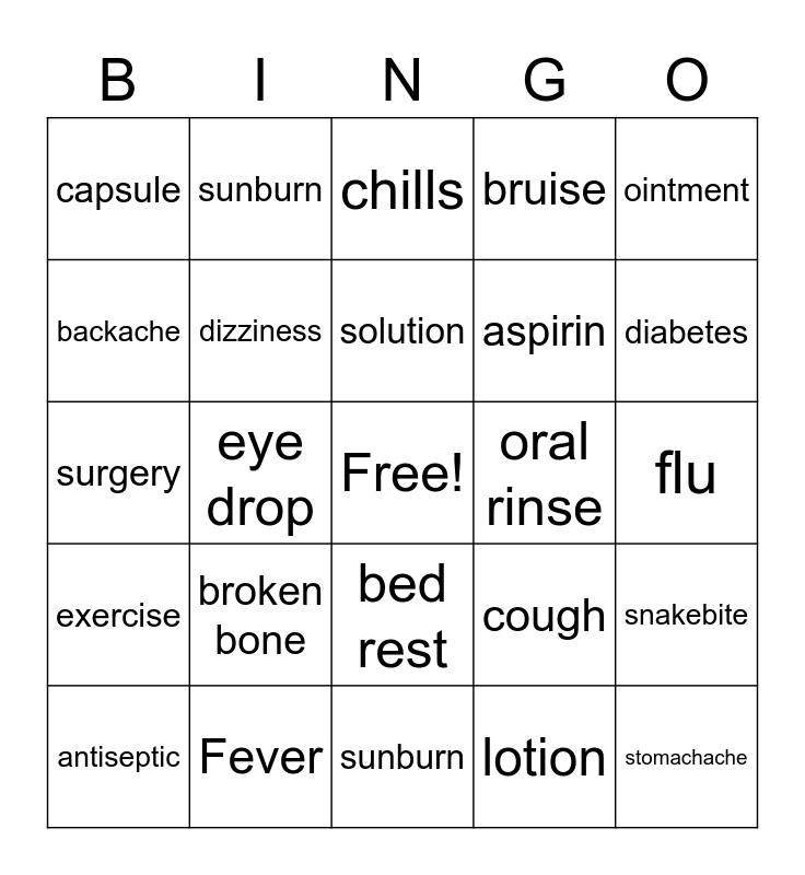 This bingo card has a free space and 53 words: fever, stomachache, runny nose, lotion, broken bone, bruise, sunburn, chills, backache, nausea, dizziness, flu, snakebite, cough, cough syrup, antiseptic, solution, oral rinse, softgel, ointment, eye drop, tablets, aspirin, capsule, caplet, Fever, high blood pressure, broken arm, injury, diabetes, sore finger, toothache, stomachache, sprain, runny nose, broken arm, bruise, sunburn, chills, backache, nausea, dizziness, flu, snakebite, cough, bed rest, blood test, diet, surgery, exercise, physical therapy, shot and massage.