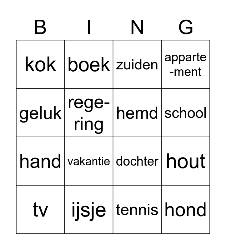 This bingo card has 16 words: ijsje, hout, zuiden, kok, hand, boek, dochter, tennis, geluk, rege- ring, tv, apparte -ment, vakantie, school, hemd and hond.