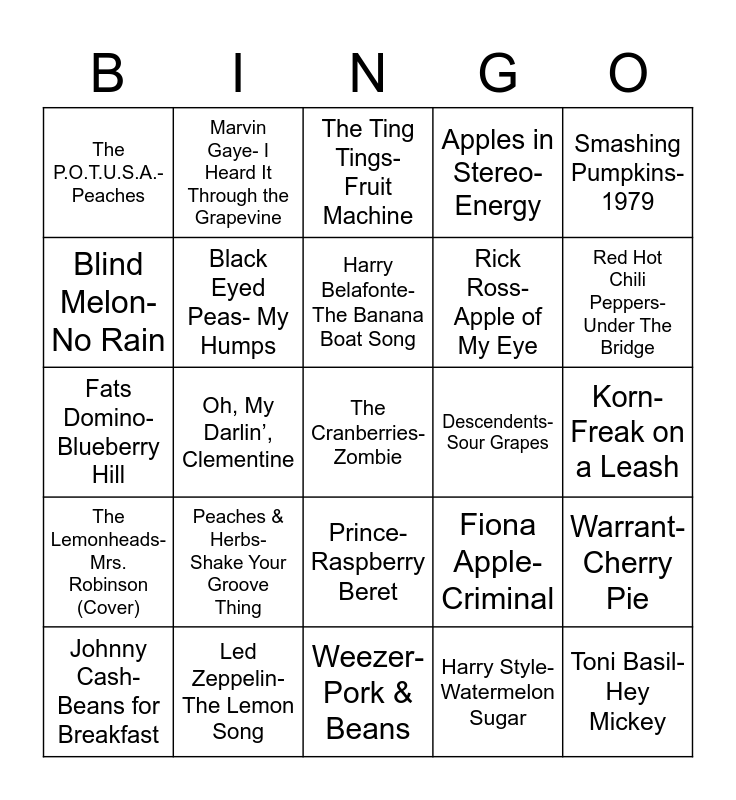 This bingo card has 26 words: Prince- Raspberry Beret, Harry Style- Watermelon Sugar, Harry Belafonte- The Banana Boat Song, Led Zeppelin- The Lemon Song, Smashing Pumpkins- 1979, The P.O.T.U.S.A.- Peaches, Blind Melon- No Rain, Marvin Gaye- I Heard It Through the Grapevine, Korn- Freak on a Leash, Fiona Apple- Criminal, Rick Ross- Apple of My Eye, Fats Domino- Blueberry Hill, Warrant- Cherry Pie, Johnny Cash- Beans for Breakfast, Oh, My Darlin’, Clementine, The Osmonds- One Bad Apple, Apples in Stereo- Energy, The Lemonheads- Mrs. Robinson (Cover), The Ting Tings- Fruit Machine, The Cranberries- Zombie, Red Hot Chili Peppers- Under The Bridge, Weezer- Pork & Beans, Descendents- Sour Grapes, Peaches & Herbs- Shake Your Groove Thing, Black Eyed Peas- My Humps and Toni Basil- Hey Mickey.