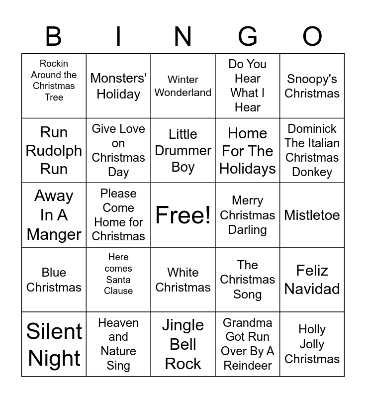 This bingo card has a free space and 47 words: Santa Baby, Holly Jolly Christmas, Little St. Nick, Jingle Bell Rock, Here comes Santa Clause, Rudolph The Red Nosed Reindeer, Monsters' Holiday, All I Want for Christmas, Run Rudolph Run, Blue Christmas, Give Love on Christmas Day, Do You Hear What I Hear, Feliz Navidad, The Christmas Song, Santa Claus Is Coming To Town, It's Beginning To Look A Lot Like Christmas, Little Drummer Boy, Merry Christmas Darling, Frosty The Snowman, Snoopy's Christmas, Please Come Home for Christmas, Grandma Got Run Over By A Reindeer, Rockin Around the Christmas Tree, Home For The Holidays, Happy Christmas, Dominick The Italian Christmas Donkey, Silent Night, Deck The Halls, White Christmas, Blue Christmas, Mary Did You Know, Silver Bells, Let It Snow, FALALA, My Only Wish, Heaven and Nature Sing, Mistletoe, Joy To The World, Hark! The Herald Angels Sing, Let It Be Christmas, O Come, All Ye Faithful, Winter Wonderland, Away In A Manger, Jingle Bells, Oh Holy Night, I Will Come Home For Christmas and Happy New Year.