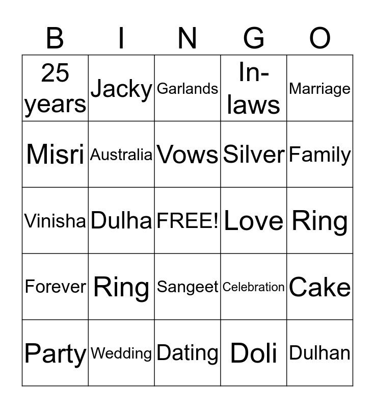 This bingo card has a free space and 24 words: Ring, Wedding, Vows, Party, Marriage, 25 years, Misri, Jacky, Love, Sangeet, Silver, Vinisha, Celebration, Cake, Australia, Doli, Ring, Garlands, Family, Dulha, Dulhan, Forever, In-laws and Dating.