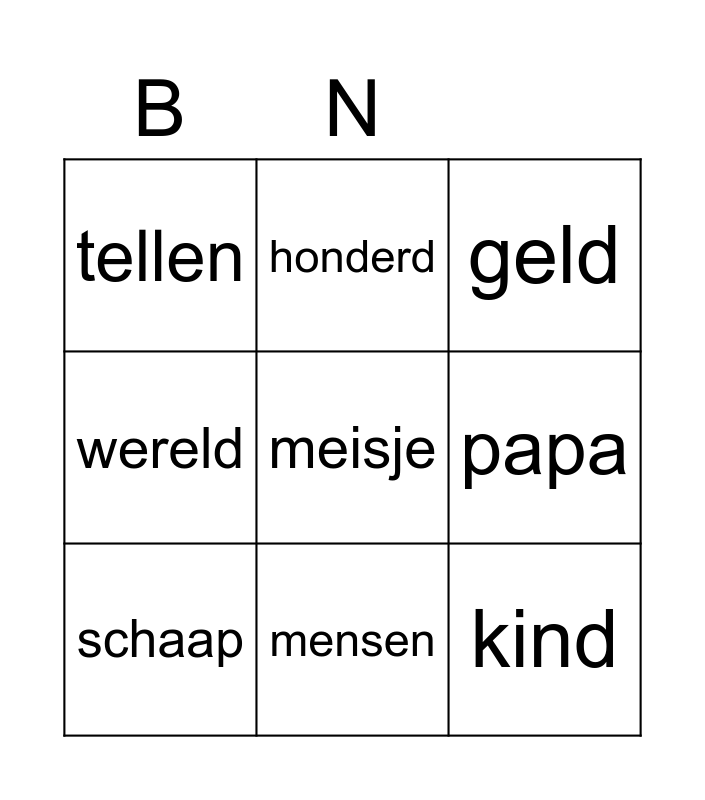 This bingo card has 12 words: jongen, kind, meisje, papa, honderd, geld, mensen, nederland, tellen, wereld, schaap and vrouw.