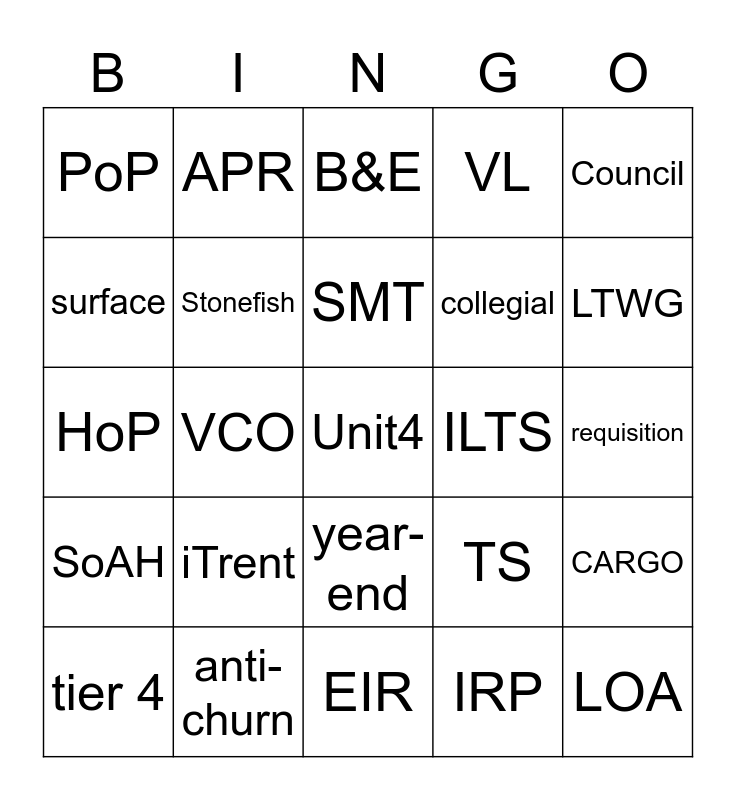 This bingo card has 50 words: ECO, Unit4, SSOT, EIR, iTrent, Landing a Jumbo Jet on the Head of a Postage Stamp, APR, Tableau, surface, ASIS, Stonefish, VL, CARGO, TS, onboarding, SLT, SMT, ILTS, Senate, Council, VCO, IRP, PoP, collegial, PO, LOA, LTWG, NSWG, B&E, year-end, Moodle, DARO, a lot of moving parts, WiP, anti-churn, Shonky apparatus, APQueries, virement, working group, requisition, goods receipt, EAP, CAS, pre-sessional, tier 4, HoP, Blackbaud, PoP, SoAH and RCA.