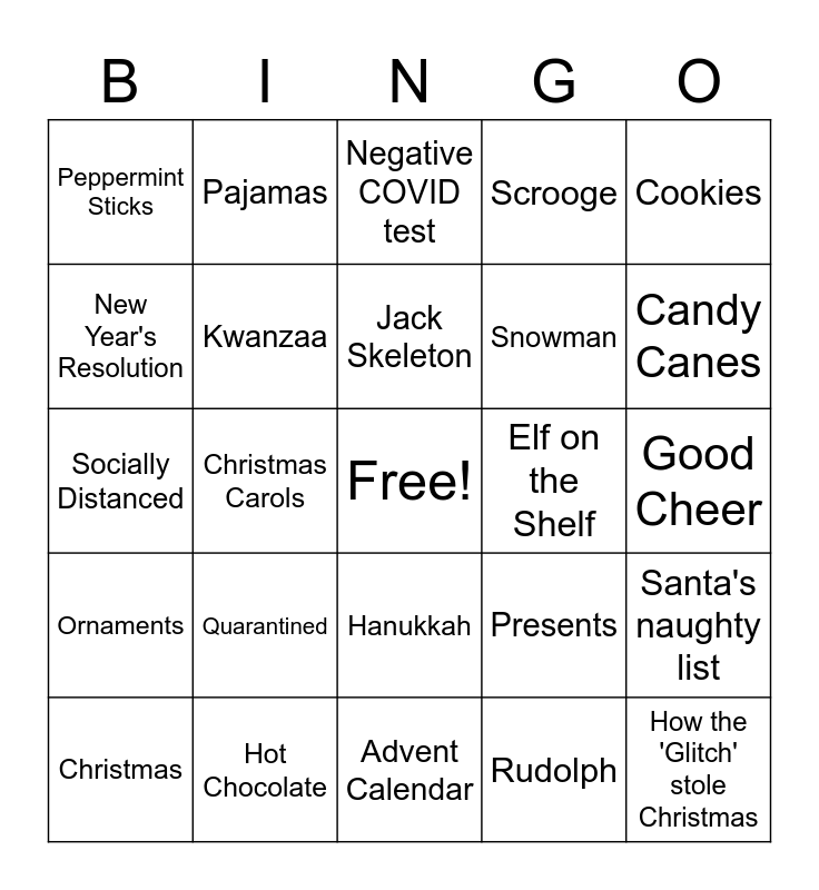 This bingo card has a free space and 24 words: Quarantined, Hot Chocolate, Jack Skeleton, Christmas, Cookies, Peppermint Sticks, New Year's Resolution, Pajamas, Elf on the Shelf, Hanukkah, Snowman, Socially Distanced, Presents, Santa's naughty list, Kwanzaa, Rudolph, Good Cheer, Negative COVID test, Candy Canes, Christmas Carols, How the 'Glitch' stole Christmas, Ornaments, Scrooge and Advent Calendar.