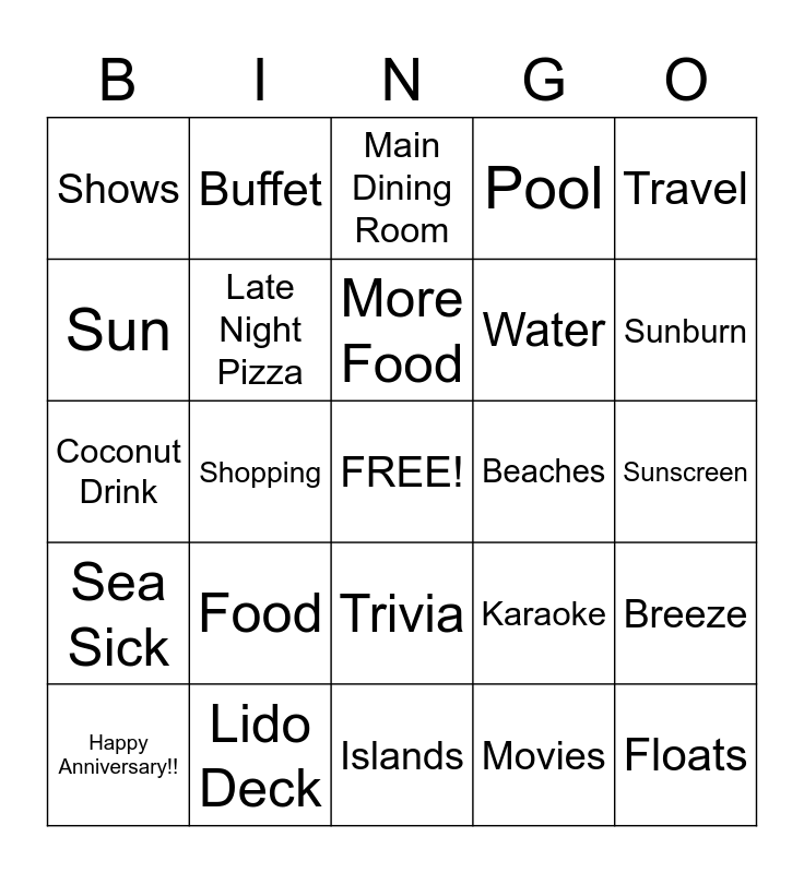 This bingo card has a free space and 39 words: 49 Years Together!, Celebration, Drinks, Late Night Pizza, Happy Anniversary!!, Trivia, More Food, Relaxing, Travel, Sea Sick, Shopping, Pool, Floats, Sunscreen, Beaches, Food, Dancing, Shows, Laughing, Karaoke, Sun, Islands, Water, Sunburn, Family, Friends, Party, Hot Tubs, Lobster, Buffet, Cruise Director, Captain, Main Dining Room, Lido Deck, Movies, Board Games, Breeze, Coconut Drink and Towel Animals.