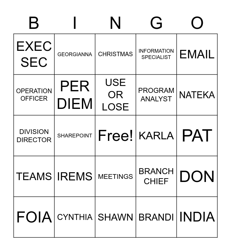 This bingo card has a free space and 29 words: FOIA, TRAVEL, SHAREPOINT, CONGRESSIONAL, EXEC SEC, CHRISTMAS, PER DIEM, IREMS, KARLA, CYNTHIA, PAT, INDIA, SHAWN, BRANDI, NATEKA, DEADLINES, MEETINGS, TEAMS, EMAIL, DIVISION DIRECTOR, BRANCH CHIEF, ACCOUNT EXECUTIVE, PROGRAM ANALYST, OPERATION OFFICER, INFORMATION SPECIALIST, GEORGIANNA, DON, USE OR LOSE and WEBTA.
