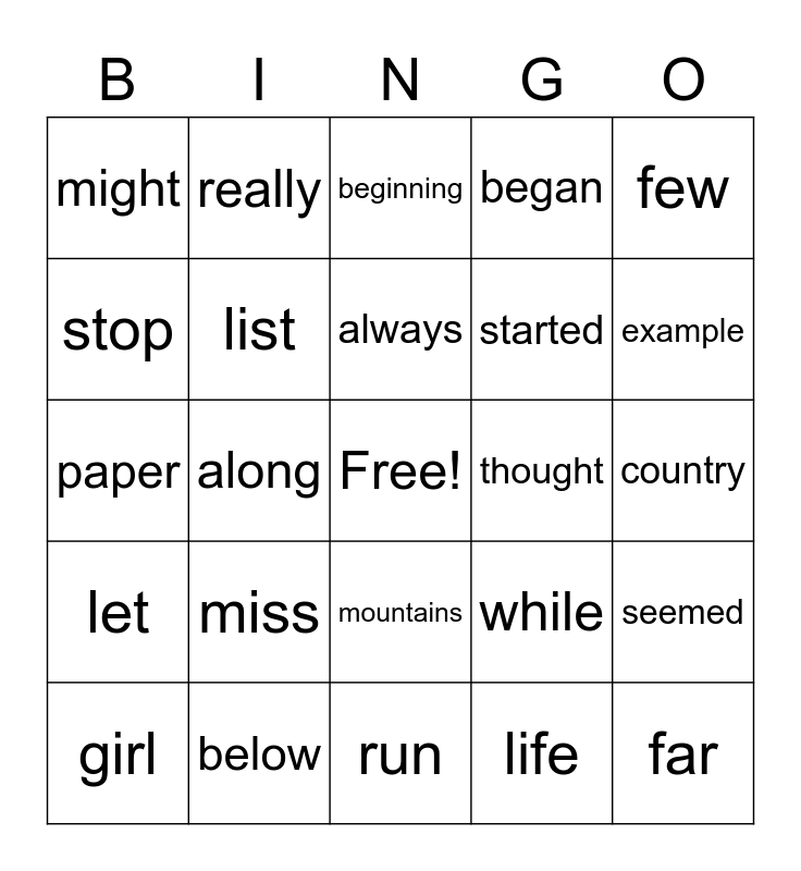 This bingo card has a free space and 100 words: high, every, country, plants, near, add, last, school, food, between, father, keep, own, below, trees, never, started, city, story, saw, earth, eyes, left, don't, light, thought, few, while, head, under, along, might, close, something, life, always, seemed, next, those, both, hard, open, paper, together, example, beginning, got, group, often, run, miles, night, important, until, walked, white, children, side, sea, began, feet, car, grow, took, river, four, without, second, carry, state, later, miss, once, book, idea, enough, hear, stop, eat, face, watch, far, sometimes, mountains, Indians, really, cut, young, almost, let, talk, soon, above, girl, list, song, being, leave, family and it's.