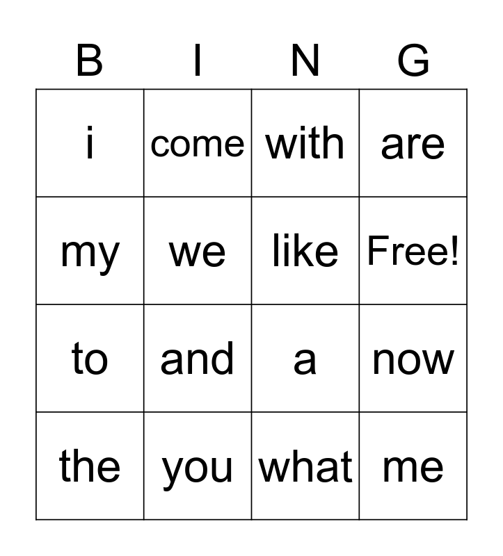 This bingo card has 17 words: what, the, with, i, and, are, now, like, Free!, we, you, a, my, come, to, me and me.