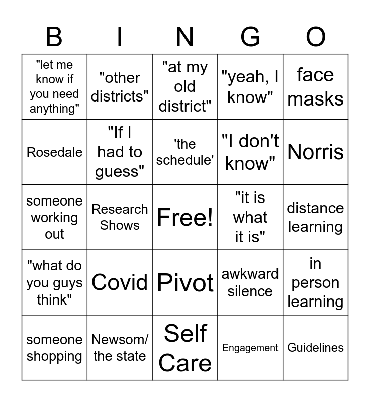 This bingo card has a free space and 24 words: Covid, Newsom/ the state, 'the schedule', someone shopping, face masks, "let me know if you need anything", Rosedale, "other districts", "it is what it is", Pivot, "I don't know", someone working out, awkward silence, in person learning, "If I had to guess", Engagement, distance learning, "at my old district", Norris, Research Shows, Guidelines, "what do you guys think", "yeah, I know" and Self Care.