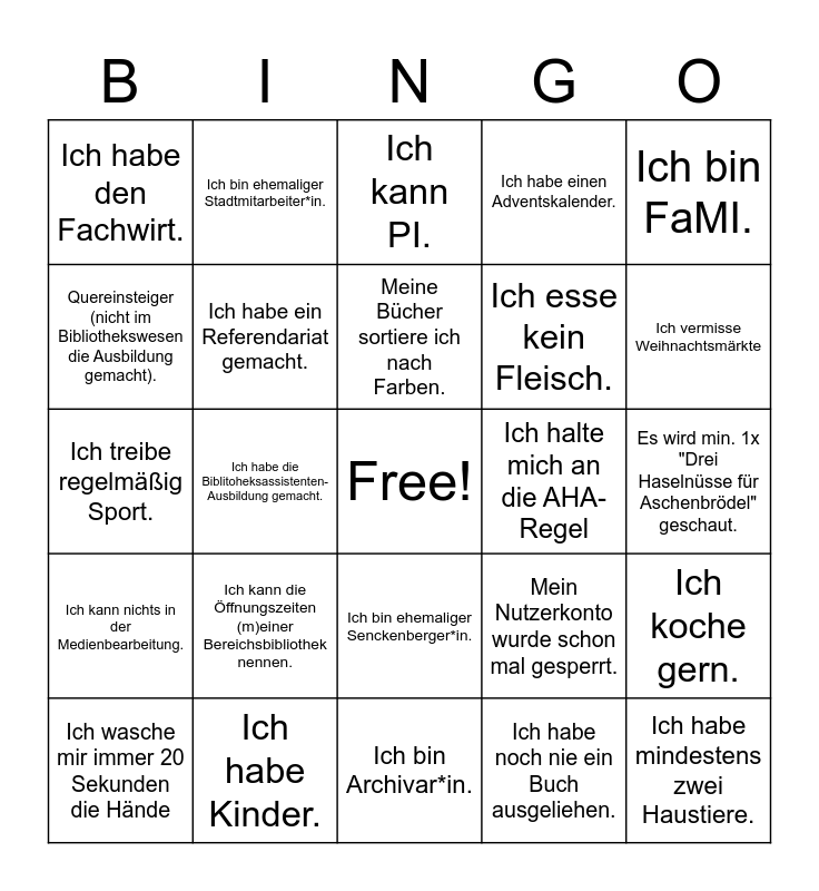 This bingo card has a free space and 45 words: Ich habe mindestens zwei Haustiere., Ich habe mindestens zwei Haustiere., Bei uns gibt es Kartoffelsalat und Würstchen an Heiligabend., Ich wasche mir immer 20 Sekunden die Hände, Ich habe schon 2 Namensänderungen der Bibliothek mitgemacht., Ich habe noch nie ein Buch ausgeliehen., Ich kann PI., Ich bin EDVler*in., Ich bin FaMI., Ich habe Kinder., Ich habe einen Adventskalender., Ich halte mich an die AHA-Regel, Ich bin ehemaliger Senckenberger*in., Ich kann die Öffnungszeiten (m)einer Bereichsbibliothek nennen., Ich kann RAK., Ich bin Archivar*in., Ich habe die Ausbildung in der UB (ehemalige Namen mit eingeschlossen) gemacht., Ich treibe regelmäßig Sport., Plätzchen backen ist ein Muss!, Ich vermisse Weihnachtsmärkte, Ich bin ehemaliger Stadtmitarbeiter*in., Ich muss an die Leihfrist erinnert werden., Ich kann RDA., Ich habe den Fachwirt., Ich wurde schon mal wegen zu Schnellen-Fahrens geblitzt., Es wird min. 1x "Drei Haselnüsse für Aschenbrödel" geschaut., Ich hab meine Symptome gegoogelt., Ich hab schon in mehr als einer Bereichsbibliothek der UB gearbeitet., Mein Nutzerkonto wurde schon mal gesperrt., Ich kann nichts in der Medienbearbeitung., Ich bin Beamter., Ich koche gern., Heißer Apfelwein / Glühwein / Kinderpunsch, Ich habe Bananenbrot gebacken., Ich habe noch nie ein Buch ausgeliehen., Ich habe die Biblitoheksassistenten-Ausbildung gemacht., Ich kann stricken., Ich gehe nicht gerne auf Weihnachtsmärkte., Ich habe mir die Haare selbst geschnitten, Meine Bücher sortiere ich nach Farben., Quereinsteiger (nicht im Bibliothekswesen die Ausbildung gemacht)., Ich esse kein Fleisch., Ich habe in meinem Schlafanzug gearbeitet, Ich habe ein Referendariat gemacht. and Ich winke immer am Ende einer Videokonferenz..