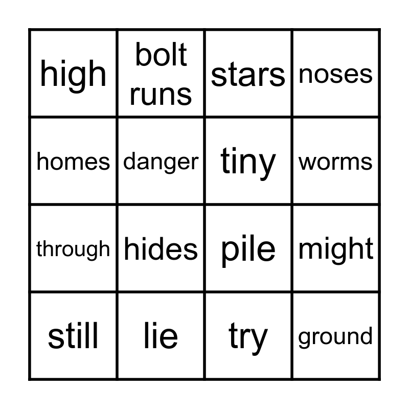 This bingo card has 30 words: sky, night, might, lights, high, stars, tiny, far away, lie, during, try, still, sun, bright, hides, Moles, animals, ground, holes, homes, pile, domes, bolt runs, through, danger, noses, poke, paws, worms and whole.