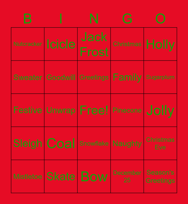 This bingo card has a free space and 89 words: Angel, Bells, Bow, Boots, Bough, Candle, Candy Cane, Caroler, Card, Celebrate, Chestnuts, Chimney, Christmas, Christmas Eve, Cider, Coal, Cookies, December 25, Decorations, Eggnog, Elf, Evergreen, Family, Feast, Festive, Frosty the Snowman, Fruitcake, Garland, Gingerbread, Gift, Goodwill, Greetings, Holiday, Holly, Hot Chocolate, Icicle, Jack Frost, Jingle Bells, Jolly, Joy, Kris Kringle, Lights, Manger, Merry Christmas, Mistletoe, Mittens, Nativity, Naughty, Nice, Nutcracker, Noel, North Pole, Ornaments, Packages, Pageant, Parade, Party, Pinecone, Poinsettia, Presents, Red & Green, Reindeer, Rejoice, Ribbon, Rudolph, Santa Claus, Scrooge, Shopping, Season's Greetings, Sleigh, Skate, Snowflake, Stocking, Sugarplum, Sweater, Tidings, Tinsel, Toboggan, Toys, Trimmings, Unwrap, Winter, Wise men, Workshop, Wrapping Paper, Wreath, Yuletide, Wish and Yule Log.