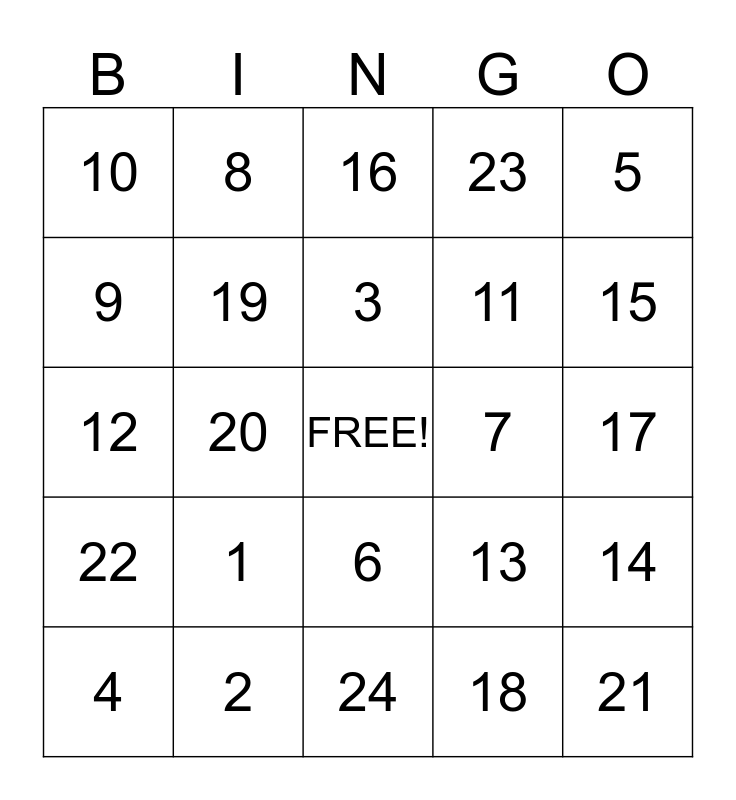 This bingo card has a free space and 24 words: 1, 2, 3, 4, 5, 10, 9, 8, 7, 6, 11, 12, 13, 14, 19, 18, 17, 16, 15, 20, 21, 22, 23 and 24.