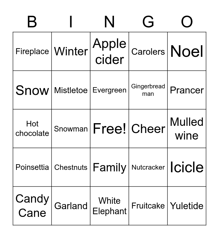 This bingo card has a free space and 24 words: Chestnuts, Garland, Evergreen, Candy Cane, Noel, Fireplace, Snow, Winter, Cheer, Family, Gingerbread man, Hot chocolate, Nutcracker, Icicle, Mistletoe, Fruitcake, Mulled wine, Apple cider, Prancer, Snowman, Yuletide, Poinsettia, Carolers and White Elephant.