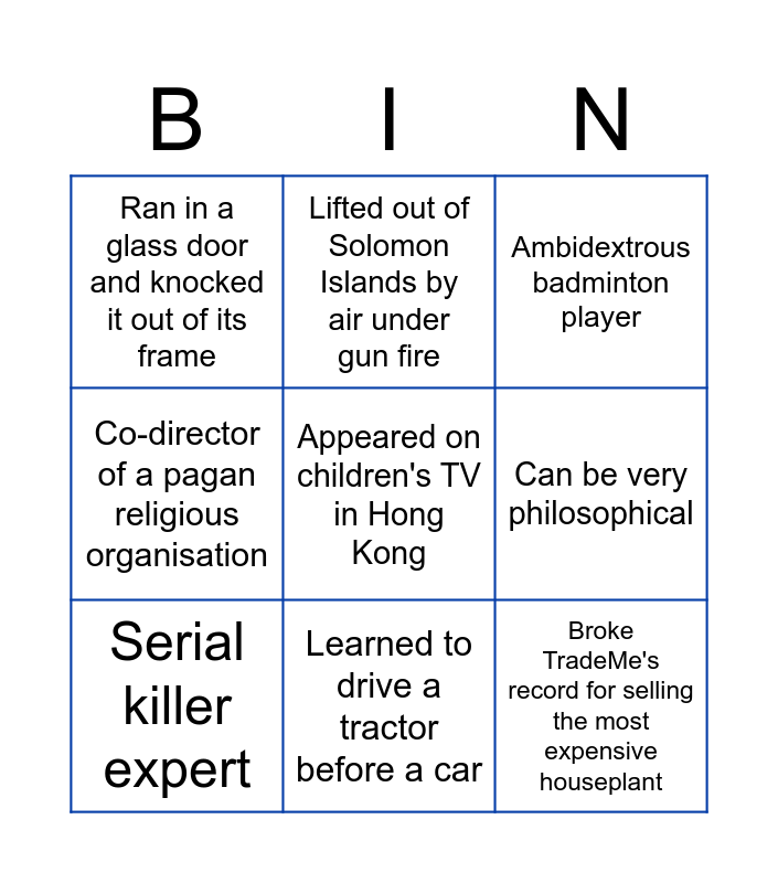 This bingo card has 17 words: Shaken the hand of Prince Charles, Worked in Formula 1, Ambidextrous badminton player, Ran in a glass door and knocked it out of its frame, First car was a rusty Honda City Turbo for $750, Co-director of a pagan religious organisation, Ran from Nelson to Christchurch, Serial killer expert, Learned to drive a tractor before a car, Can be very philosophical, Loves his cordless drill & table saw, Graduated high school at 15, Appeared on children's TV in Hong Kong, Lifted out of Solomon Islands by air under gun fire, Broke TradeMe's record for selling the most expensive houseplant, Loves period dramas and Knows NZ sign language.