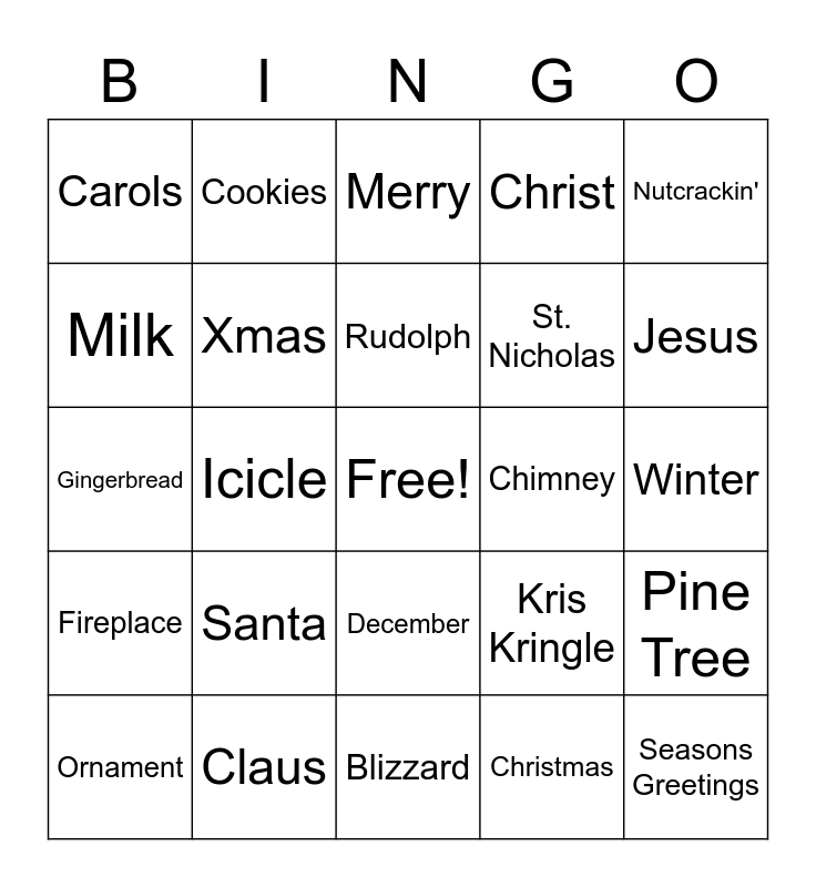 This bingo card has a free space and 24 words: Santa, Claus, Rudolph, Ornament, Nutcrackin', Carols, Milk, Cookies, Chimney, December, St. Nicholas, Gingerbread, Kris Kringle, Pine Tree, Xmas, Christmas, Winter, Merry, Jesus, Icicle, Seasons Greetings, Fireplace, Christ and Blizzard.
