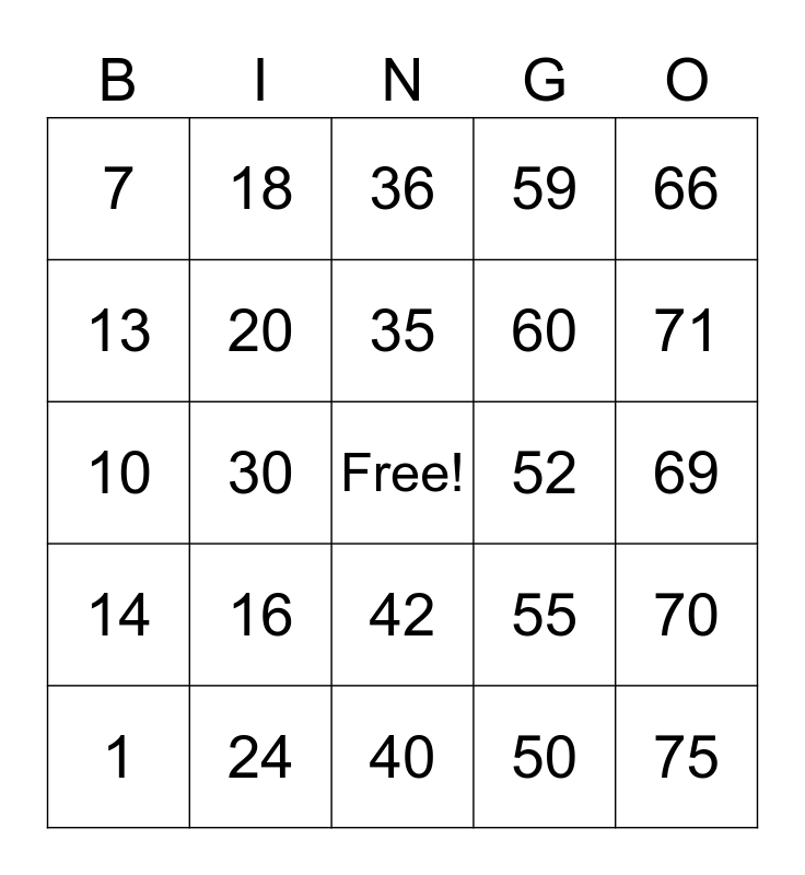 This bingo card has a free space and 24 words: 1, 16, 35, 50, 66, 7, 18, 36, 52, 69, 10, 20, 55, 70, 13, 24, 40, 59, 71, 14, 30, 42, 60 and 75.