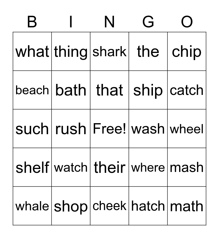 This bingo card has a free space and 24 words: watch, shop, that, whale, chip, what, beach, thing, wash, their, ship, such, where, mash, bath, hatch, wheel, shark, catch, rush, math, shelf, the and cheek.