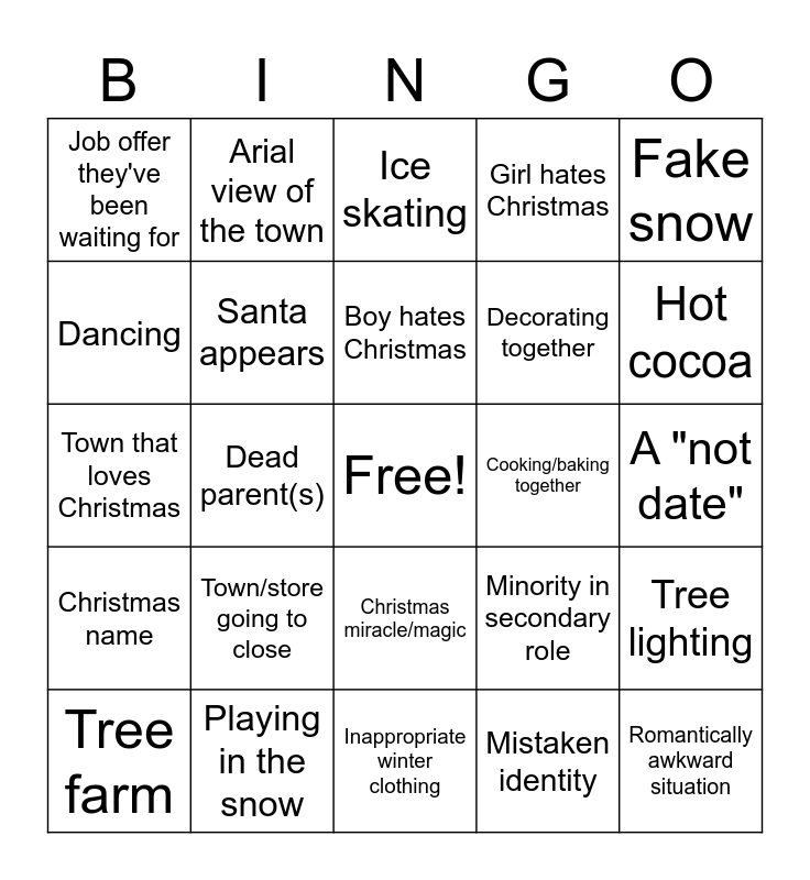 This bingo card has a free space and 24 words: Town/store going to close, Playing in the snow, Boy hates Christmas, Tree farm, Fake snow, Job offer they've been waiting for, Dancing, Arial view of the town, Cooking/baking together, Christmas miracle/magic, Decorating together, Town that loves Christmas, Minority in secondary role, Tree lighting, Santa appears, Mistaken identity, A "not date", Ice skating, Hot cocoa, Dead parent(s), Romantically awkward situation, Christmas name, Girl hates Christmas and Inappropriate winter clothing.