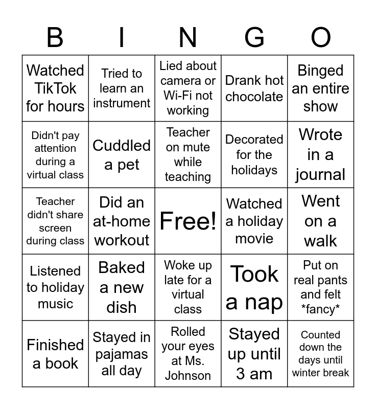 This bingo card has a free space and 24 words: Baked a new dish, Stayed in pajamas all day, Teacher on mute while teaching, Finished a book, Binged an entire show, Watched TikTok for hours, Didn't pay attention during a virtual class, Tried to learn an instrument, Watched a holiday movie, Woke up late for a virtual class, Decorated for the holidays, Teacher didn't share screen during class, Took a nap, Put on real pants and felt *fancy*, Cuddled a pet, Stayed up until 3 am, Went on a walk, Lied about camera or Wi-Fi not working, Wrote in a journal, Did an at-home workout, Counted down the days until winter break, Listened to holiday music, Drank hot chocolate and Rolled your eyes at Ms. Johnson.