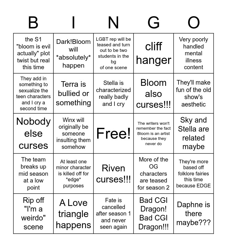 This bingo card has a free space and 24 words: At least one minor character is killed off for *edge* purposes, A Love triangle happens, Stella is characterized really badly and I cry, Rip off "I'm a weirdo" scene, Very poorly handled mental illness content, the S1 "bloom is evil actually" plot twist but real this time, They add in something to sexualize the teen characters and I cry a second time, Dark!Bloom will *absolutely* happen, The writers won't remember the fact Bloom is an artist because they never do, Riven curses!!!, Bloom also curses!!!, Nobody else curses, More of the OG characters are teased for season 2, They're more based off folklore fairies this time because EDGE, Terra is bullied or something, Bad CGI Dragon! Bad CGI Dragon!!!, Sky and Stella are related maybe, LGBT rep will be teased and turn out to be two students in the bg of one scene, They'll make fun of the old show's aesthetic, Winx will originally be someone insulting them somehow, Daphne is there maybe???, The team breaks up mid season at a low point, cliff hanger and Fate is cancelled after season 1 and never seen again.