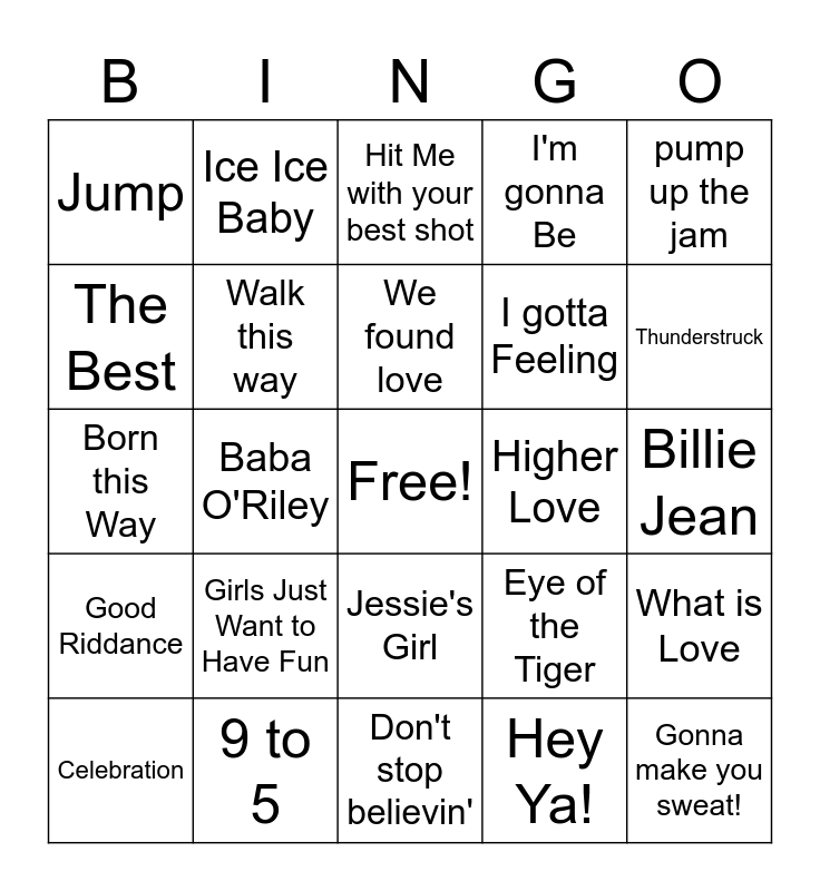 This bingo card has a free space and 29 words: Celebration, Rolling in the Deep, Baba O'Riley, Jump Around, Jump, Hit Me with your best shot, Walk this way, Girls Just Want to Have Fun, Higher Love, 9 to 5, Billie Jean, Gonna make you sweat!, Don't stop believin', Hey Ya!, Thunderstruck, Summer of '69, Jessie's Girl, Good Riddance, pump up the jam, Born this Way, Eye of the Tiger, Cruise, I gotta Feeling, The Best, I'm gonna Be, Ice Ice Baby, What is Love, We found love and Crazy in Love.