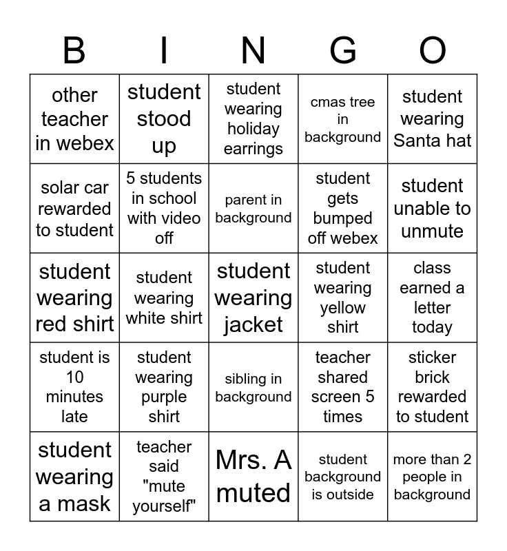 This bingo card has 25 words: student wearing purple shirt, Mrs. A muted, parent in background, student wearing a mask, student wearing Santa hat, other teacher in webex, solar car rewarded to student, student stood up, student wearing yellow shirt, sibling in background, student gets bumped off webex, student wearing red shirt, teacher shared screen 5 times, sticker brick rewarded to student, 5 students in school with video off, more than 2 people in background, class earned a letter today, student wearing holiday earrings, student unable to unmute, student wearing white shirt, student wearing jacket, teacher said "mute yourself", student is 10 minutes late, cmas tree in background and student background is outside.