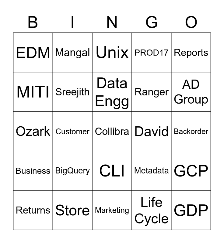 This bingo card has 50 words: Data, Collibra, W+, Marketing, BigQuery, Azure, Mangal, Governance, MITI, Atomic, Sreejith, PROD17, GCP, Metadata, Service Now, DSI, Data Engg, David, Finance, Reports, Customer, Life Cycle, EDM, Ranger, Python, GDP, AD Group, Data Model, Unix, CLI, Scrum, JIRA, Data Discovery, SQL, Store, Dotcom, Omni, Supply Chain, Teradata, Backorder, Store Pickup, Github, Package Delivery, Replacement, Returns, Ozark, OTIF, UDP, Business and Spark.