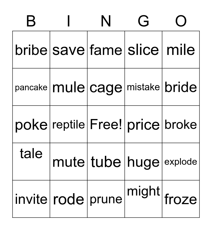 This bingo card has a free space and 34 words: cupcake, might, file, pie, tale, mule, mile, invite, save, cone, cage, fame, lane, dive, price, bride, rode, poke, mute, huge, tube, brace, bribe, broke, prune, froze, slice, combine, mistake, pancake, confuse, reptile, explode and inside.