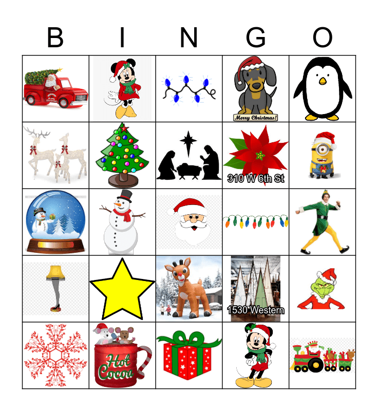 This bingo card has 37 images, a free space and 5 words: Sunset Home - spot 36 evergreens, 1254 Manvel, 1530 Western, 310 W 6th St and Kittson.