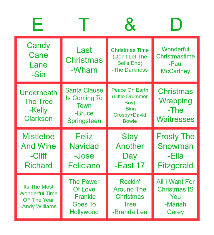 This bingo card has 32 words: Walking In The Air -Aled Jones, Santa Baby -Kylie Minogue, Frosty The Snowman -Ella Fitzgerald, One More Sleep -Leona Lewis, All I Want For Christmas IS You -Mariah Carey, Peace On Earth (Little Drummer Boy) -Bing Crosby+David Bowie, Underneath The Tree -Kelly Clarkson, Happy Xmas (War Is Over) -John Lennon+Yoko Ono, Last Christmas -Wham, Stop The Cavalry -Jona Lewie, Christmas Wrapping -The Waitresses, Christmas Time (Don't Let The Bells End) -The Darkness, Santa Tell Me -Ariana Grande, Sleigh Ride -The Ronettes, The Power Of Love -Frankie Goes To Hollywood, Mary's Boy (Oh My Lord) -Boney M, Step Into Christmas -Elton John, Stay Another Day -East 17, Merry Christmas Everyone -Shakin' Stevens, Merry Christmas Everybody -Slade, Driving Home For Christmas -Chris Rae, I Wish IT Could Be Christmas Everyday -Wizzard, Rockin' Around The Christmas Tree -Brenda Lee, 8 Days Of Christmas -Destinys Child, Its The Most Wonderful Time OF The Year -Andy Williams, Wonderful Christmastime -Paul McCartney, Mistletoe And Wine -Cliff Richard, Santa Clause Is Coming To Town -Bruce Springsteen, Candy Cane Lane -Sia, Its Beginning to Look A lot Like Christmas -Michael Buble, Jingle Bell Rock -Bobby Helms and Feliz Navidad -Jose Feliciano.
