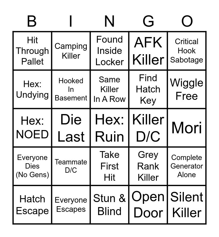 This bingo card has a free space and 29 words: Hatch Escape, Die First, Die Last, Get Left Behind, Hit Through Pallet, Found Inside Locker, Hooked In Basement, Teammate D/C, Killer D/C, Everyone Escapes, Mori, Silent Killer, Stun & Blind, Open Door, Wiggle Free, Healed From Dying, Take First Hit, Everyone Dies (No Gens), Critical Hook Sabotage, Hex: NOED, Grey Rank Killer, Early Hex Cleanse, Find Hatch Key, Hex: Undying, AFK Killer, Camping Killer, Complete Generator Alone, Same Killer In A Row and 'TTV' Killer.