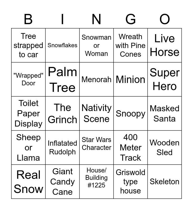 This bingo card has 25 words: Inflatated Rudolph, House/ Building #1225, Menorah, Real Snow, Live Horse, Tree strapped to car, "Wrapped" Door, Snowflakes, Snoopy, Star Wars Character, Minion, Toilet Paper Display, 400 Meter Track, Wooden Sled, Palm Tree, Skeleton, Masked Santa, Snowman or Woman, Super Hero, The Grinch, Nativity Scene, Giant Candy Cane, Sheep or Llama, Wreath with Pine Cones and Griswold type house.