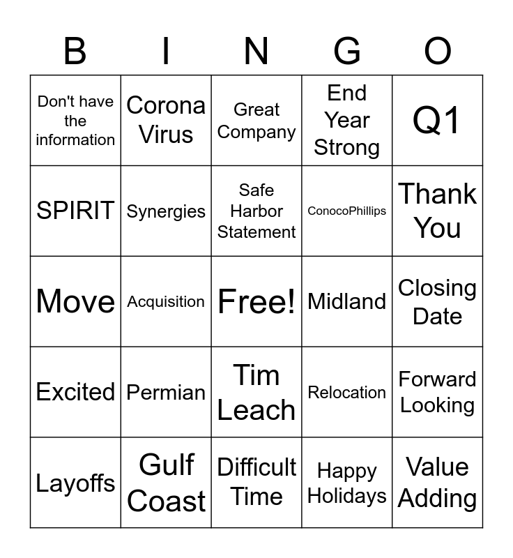 This bingo card has a free space and 29 words: Layoffs, EOI, Acquisition, Merger, Don't have the information, Great Company, Synergies, Permian, Midland, Gulf Coast, Closing Date, Value Adding, Difficult Time, Happy Holidays, Thank You, Safety, Tim Leach, Excited, Q1, Move, Relocation, Concho, ConocoPhillips, SPIRIT, End Year Strong, Corona Virus, Forward Looking, Safe Harbor Statement and Corporate.