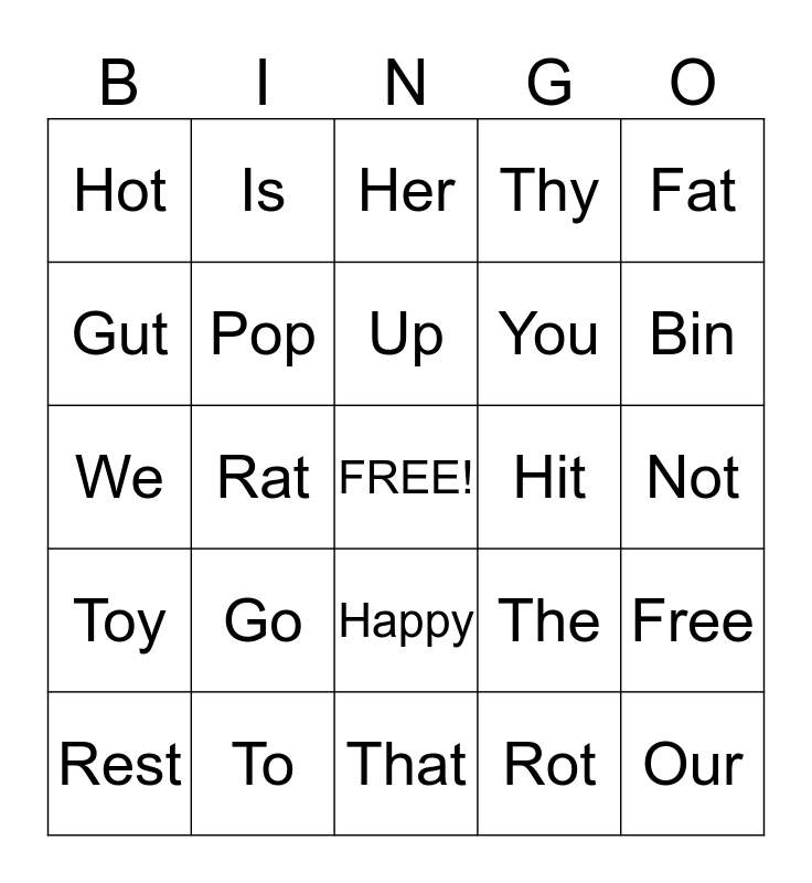 This bingo card has a free space and 24 words: Go, To, Up, Rest, Fat, Hot, Gut, Is, Hit, Happy, You, We, The, Free, Pop, Rot, Not, Her, Bin, Rat, Our, Toy, Thy and That.