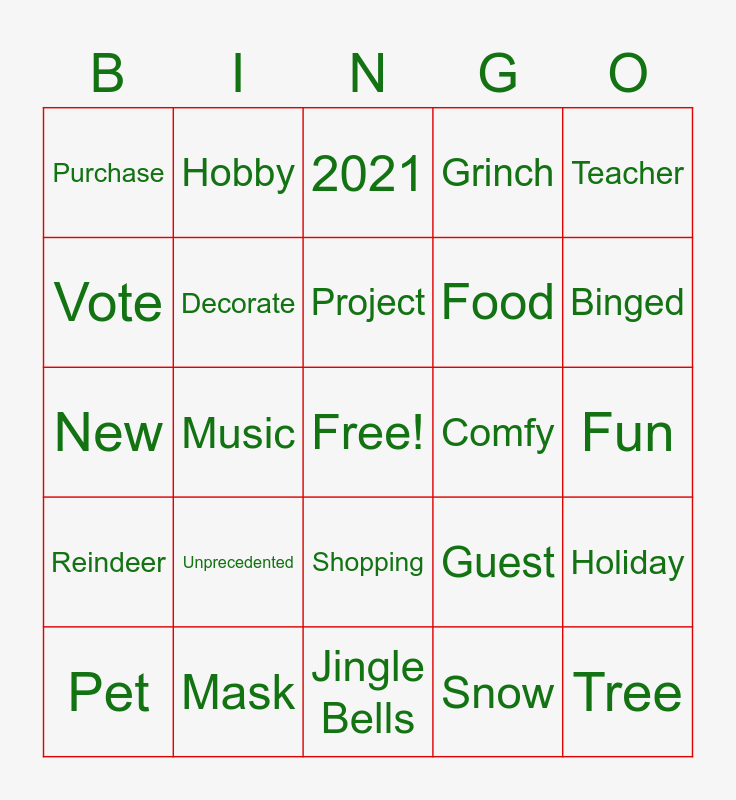 This bingo card has a free space and 24 words: Unprecedented, Mask, Project, Pet, Teacher, Purchase, Vote, Hobby, Comfy, Shopping, Food, New, Guest, Holiday, Decorate, Snow, Fun, 2021, Binged, Music, Tree, Reindeer, Grinch and Jingle Bells.